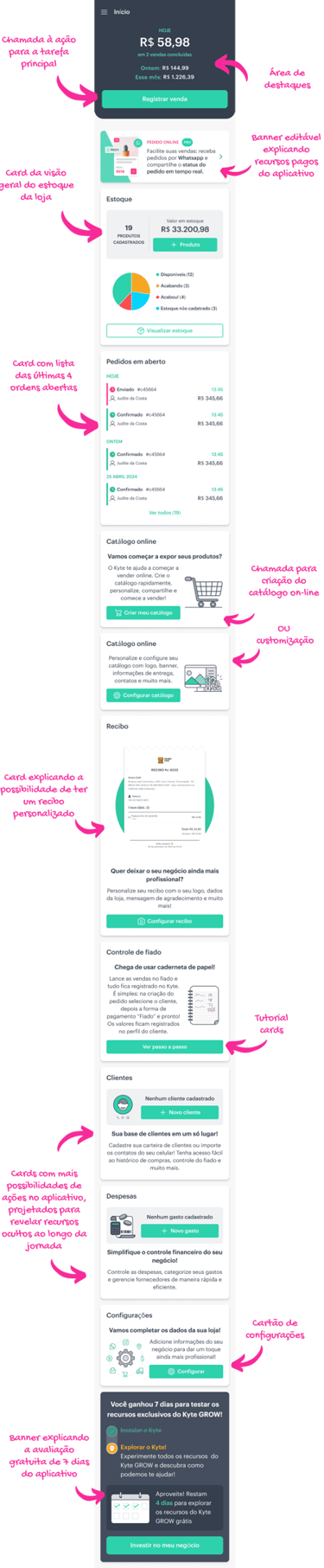 Criar uma tela inicial modular no aplicativo, onde poderíamos direcionar o usuário à realizar os principais "jobs" (JTBD) entendendo melhor a proposta de valor do Kyte.